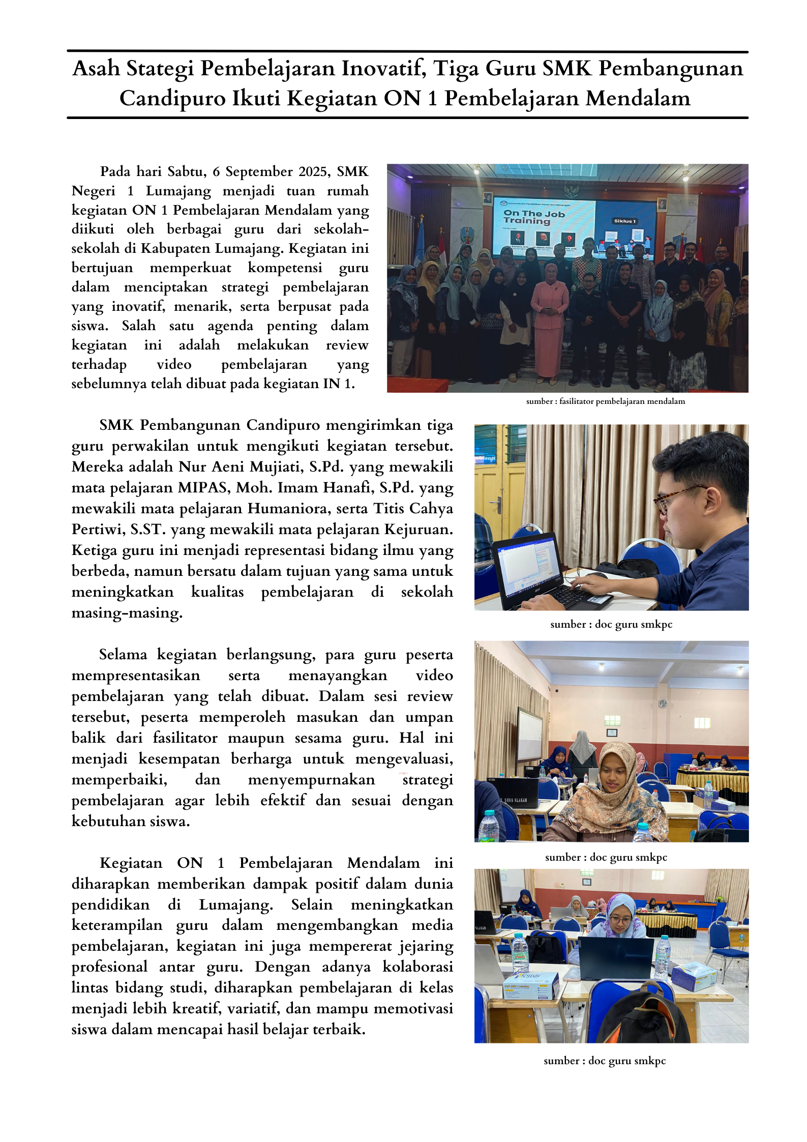 SMK Pembangunan Candipuro mengirimkan tiga guru perwakilan untuk mengikuti kegiatan tersebut. Mereka adalah Nur Aeni Mujiati, S.Pd. yang mewakili mata pelajaran MIPAS, Moh. Imam Hanafi, S.Pd. yang mewakili mata pelajaran Humaniora, serta Titis Cahya Pertiwi, S.ST. yang mewakili mata pelajaran Kejuruan. Ketiga guru ini menjadi representasi bidang ilmu yang berbeda, namun bersatu dalam tujuan yang sama untuk meningkatkan kualitas pembelajaran di sekolah masing-masing.