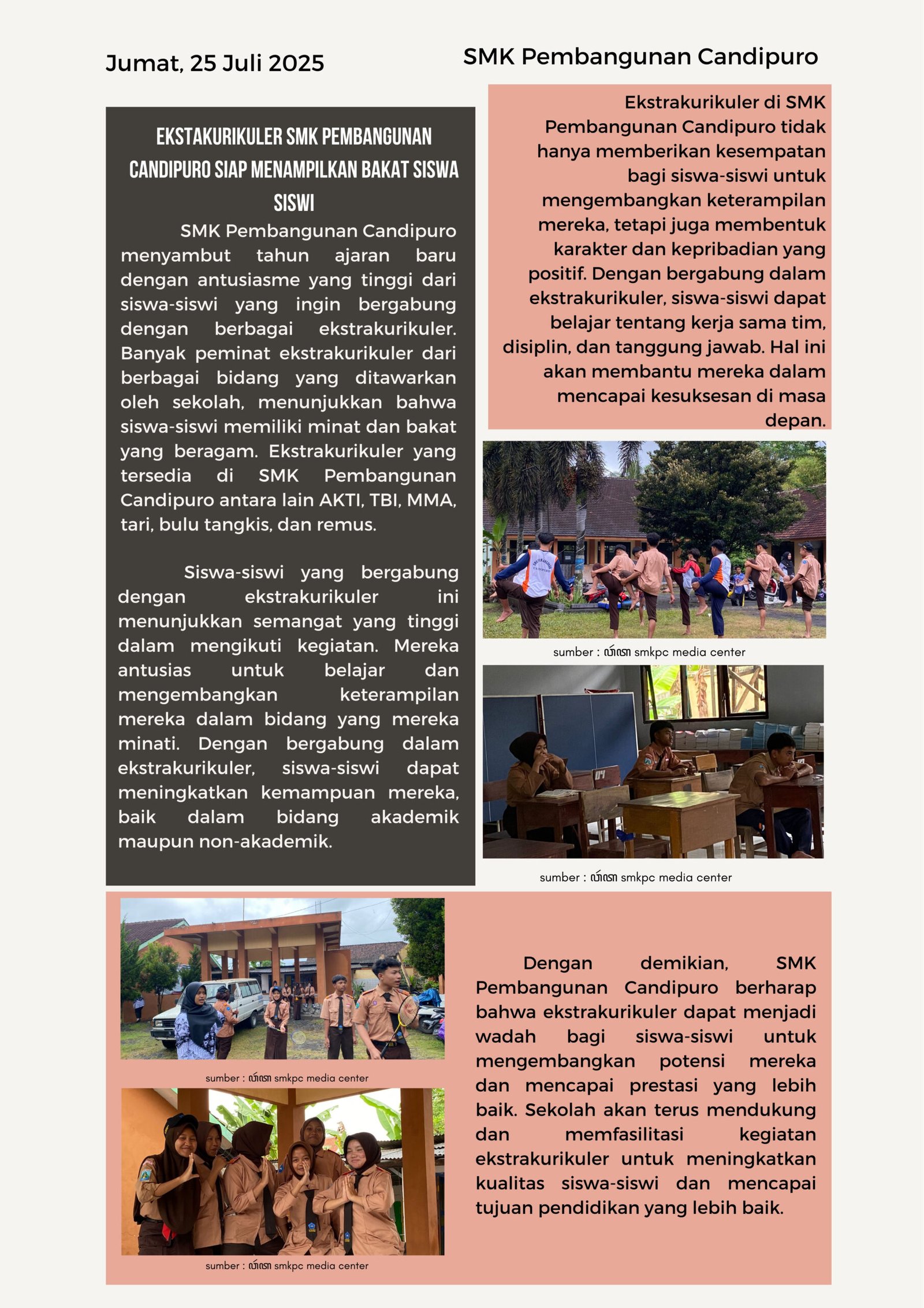 SMK Pembangunan Candipuro menyambut tahun ajaran baru dengan antusiasme yang tinggi dari siswa-siswi yang ingin bergabung dengan berbagai ekstrakurikuler. Banyak peminat ekstrakurikuler dari berbagai bidang yang ditawarkan oleh sekolah, menunjukkan bahwa siswa-siswi memiliki minat dan bakat yang beragam. Ekstrakurikuler yang tersedia di SMK Pembangunan Candipuro antara lain AKTI, TBI, MMA, tari, bulu tangkis, dan remus.