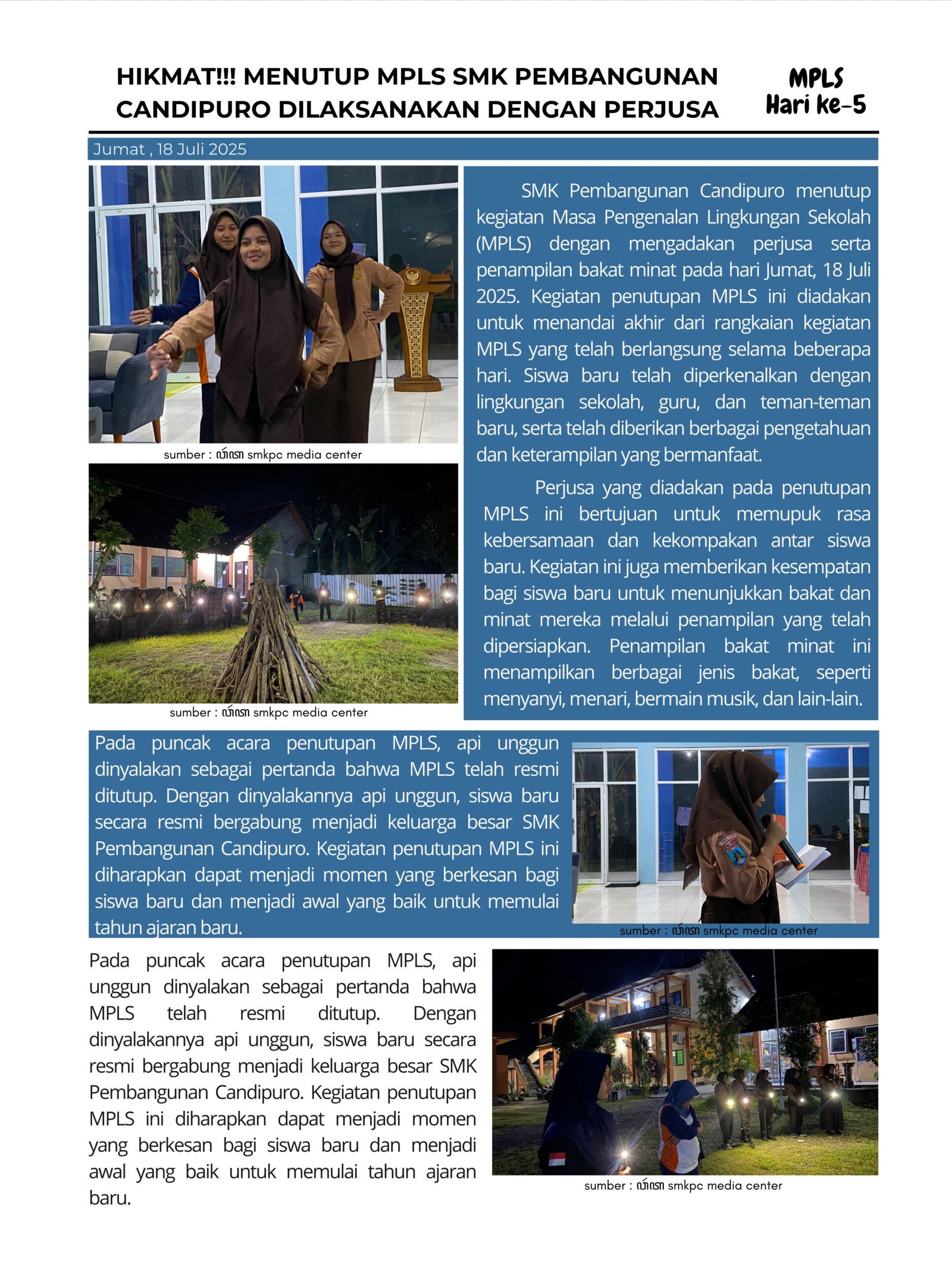 SMK Pembangunan Candipuro menutup kegiatan Masa Pengenalan Lingkungan Sekolah (MPLS) dengan mengadakan perjusa serta penampilan bakat minat pada hari Jumat, 18 Juli 2025. Kegiatan penutupan MPLS ini diadakan untuk menandai akhir dari rangkaian kegiatan MPLS yang telah berlangsung selama beberapa hari. Siswa baru telah diperkenalkan dengan lingkungan sekolah, guru, dan teman-teman baru, serta telah diberikan berbagai pengetahuan dan keterampilan yang bermanfaat.