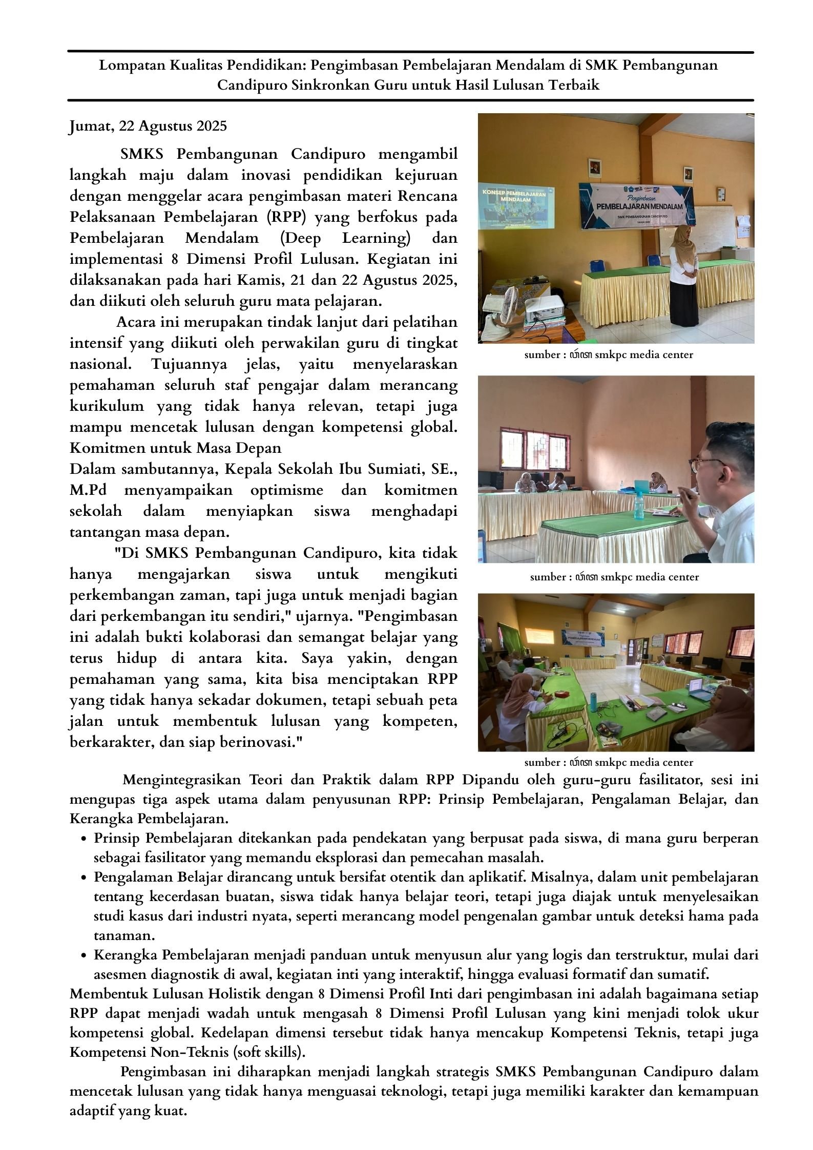 SMKS Pembangunan Candipuro mengambil langkah maju dalam inovasi pendidikan kejuruan dengan menggelar acara pengimbasan materi Rencana Pelaksanaan Pembelajaran (RPP) yang berfokus pada Pembelajaran Mendalam (Deep Learning) dan implementasi 8 Dimensi Profil Lulusan. Kegiatan ini dilaksanakan pada hari Kamis, 21 dan 22 Agustus 2025, dan diikuti oleh seluruh guru mata pelajaran.
