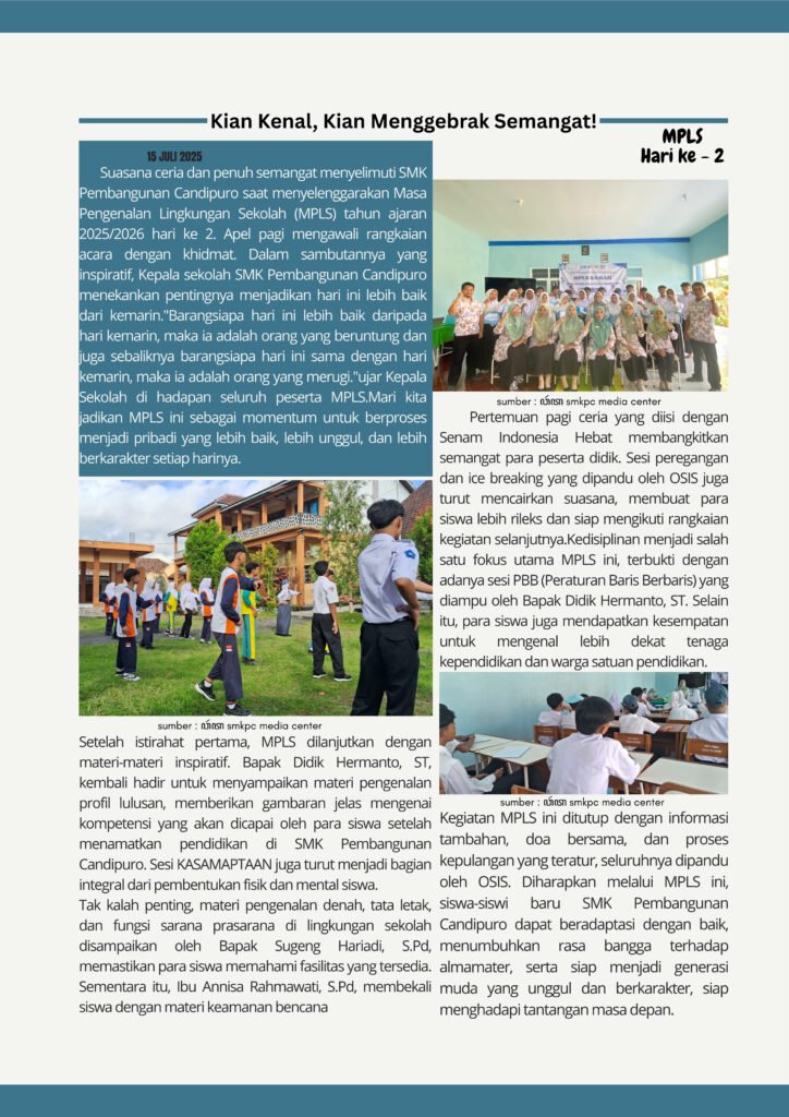 Suasana ceria dan penuh semangat menyelimuti SMK Pembangunan Candipuro saat menyelenggarakan Masa Pengenalan Lingkungan Sekolah (MPLS) tahun ajaran 2025/2026 hari ke 2. Apel pagi mengawali rangkaian acara dengan khidmat. Dalam sambutannya yang inspiratif, Kepala sekolah SMK Pembangunan Candipuro menekankan pentingnya menjadikan hari ini lebih baik dari kemarin.”Barangsiapa hari ini lebih baik daripada hari kemarin, maka ia adalah orang yang beruntung dan juga sebaliknya barangsiapa hari ini sama dengan hari kemarin, maka ia adalah orang yang merugi.”ujar Kepala Sekolah di hadapan seluruh peserta MPLS.Mari kita jadikan MPLS ini sebagai momentum untuk berproses menjadi pribadi yang lebih baik, lebih unggul, dan lebih berkarakter setiap harinya.