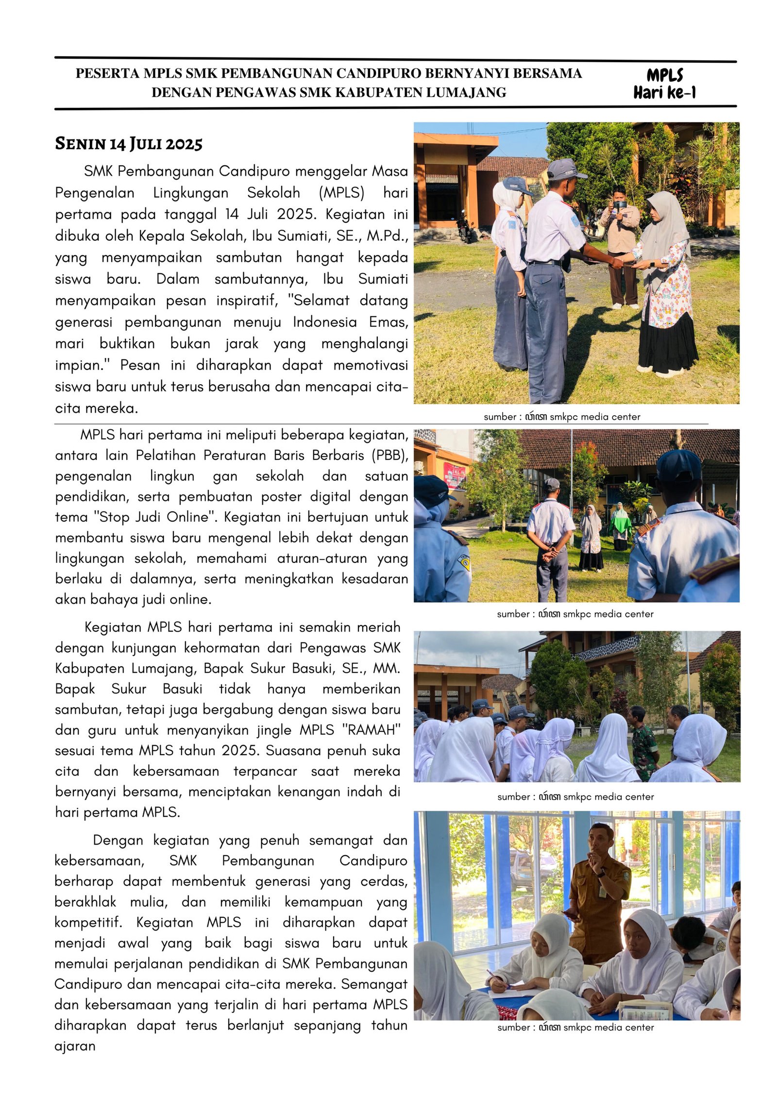 Dengan kegiatan yang penuh semangat dan kebersamaan, SMK Pembangunan Candipuro berharap dapat membentuk generasi yang cerdas, berakhlak mulia, dan memiliki kemampuan yang kompetitif. Kegiatan MPLS ini diharapkan dapat menjadi awal yang baik bagi siswa baru untuk memulai perjalanan pendidikan di SMK Pembangunan Candipuro dan mencapai cita-cita mereka. Semangat dan kebersamaan yang terjalin di hari pertama MPLS diharapkan dapat terus berlanjut sepanjang tahun ajaran