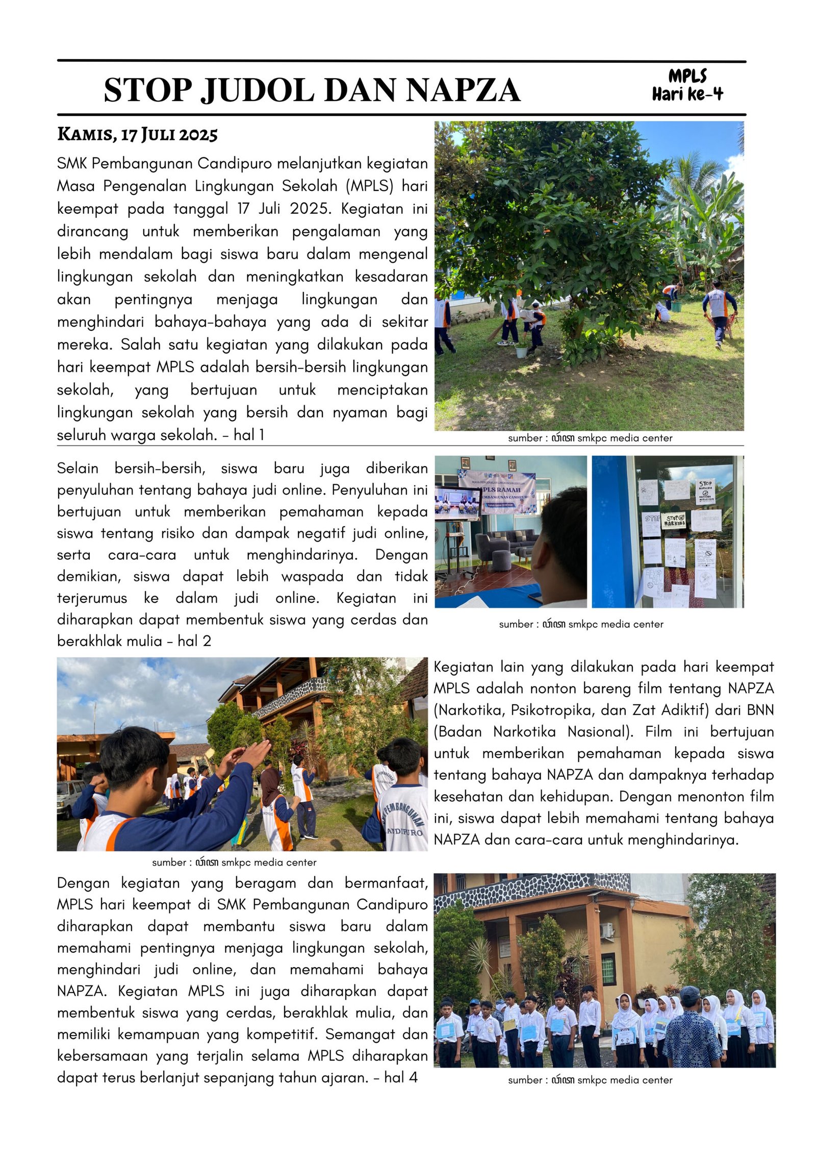 SMK Pembangunan Candipuro melanjutkan kegiatan Masa Pengenalan Lingkungan Sekolah (MPLS) hari keempat pada tanggal 17 Juli 2025. Kegiatan ini dirancang untuk memberikan pengalaman yang lebih mendalam bagi siswa baru dalam mengenal lingkungan sekolah dan meningkatkan kesadaran akan pentingnya menjaga lingkungan dan menghindari bahaya-bahaya yang ada di sekitar mereka. Salah satu kegiatan yang dilakukan pada hari keempat MPLS adalah bersih-bersih lingkungan sekolah, yang bertujuan untuk menciptakan lingkungan sekolah yang bersih dan nyaman bagi seluruh warga sekolah. – hal 1
